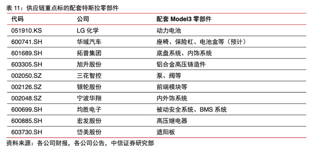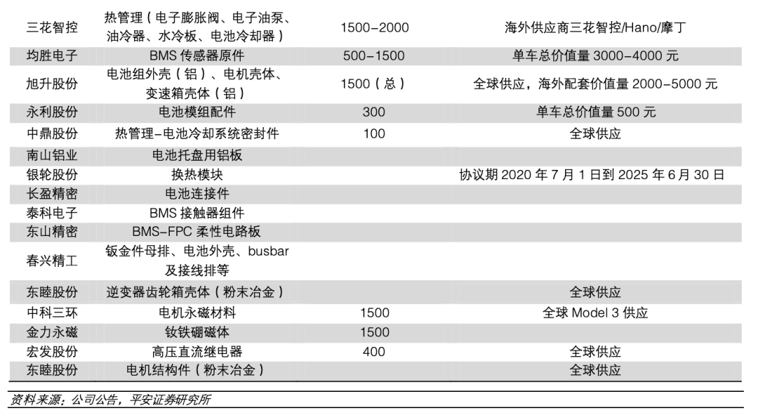 依托中國(guó)成熟、高效的零部件供應(yīng)鏈體系,大量零部件料將國(guó)產(chǎn)化、本地化供應(yīng)。其中:旭升股份、拓普集團(tuán)、三花智控、寧波華翔、華域汽車(chē)、岱美股份等單車(chē)價(jià)值量較大。