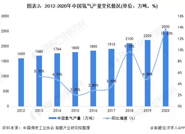 經(jīng)過(guò)十余年的長(zhǎng)足發(fā)展,我國(guó)氫氣年產(chǎn)量已逾千萬(wàn)噸規(guī)模,位居世界第一大產(chǎn)氫國(guó)。據(jù)中國(guó)煤炭工業(yè)協(xié)會(huì)數(shù)據(jù)統(tǒng)計(jì),2012-2020年,中國(guó)氫氣產(chǎn)量整體呈穩(wěn)步增長(zhǎng)趨勢(shì)。其中2019年-2020年,同比增速最為顯著,達(dá)到13.6%,且2020年,中國(guó)氫氣產(chǎn)量超過(guò)2500萬(wàn)噸。