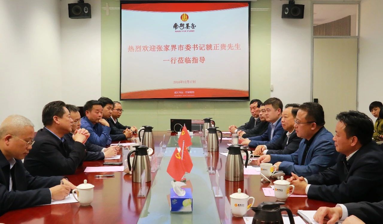 12月17日晚間,張家界市委書記、市人大常委會(huì)主任虢正貴一行來(lái)到廣州南粵基金集團(tuán)有限公司(簡(jiǎn)稱“南粵基金”)考察,并與南粵基金董事長(zhǎng)林濤進(jìn)行了會(huì)談。