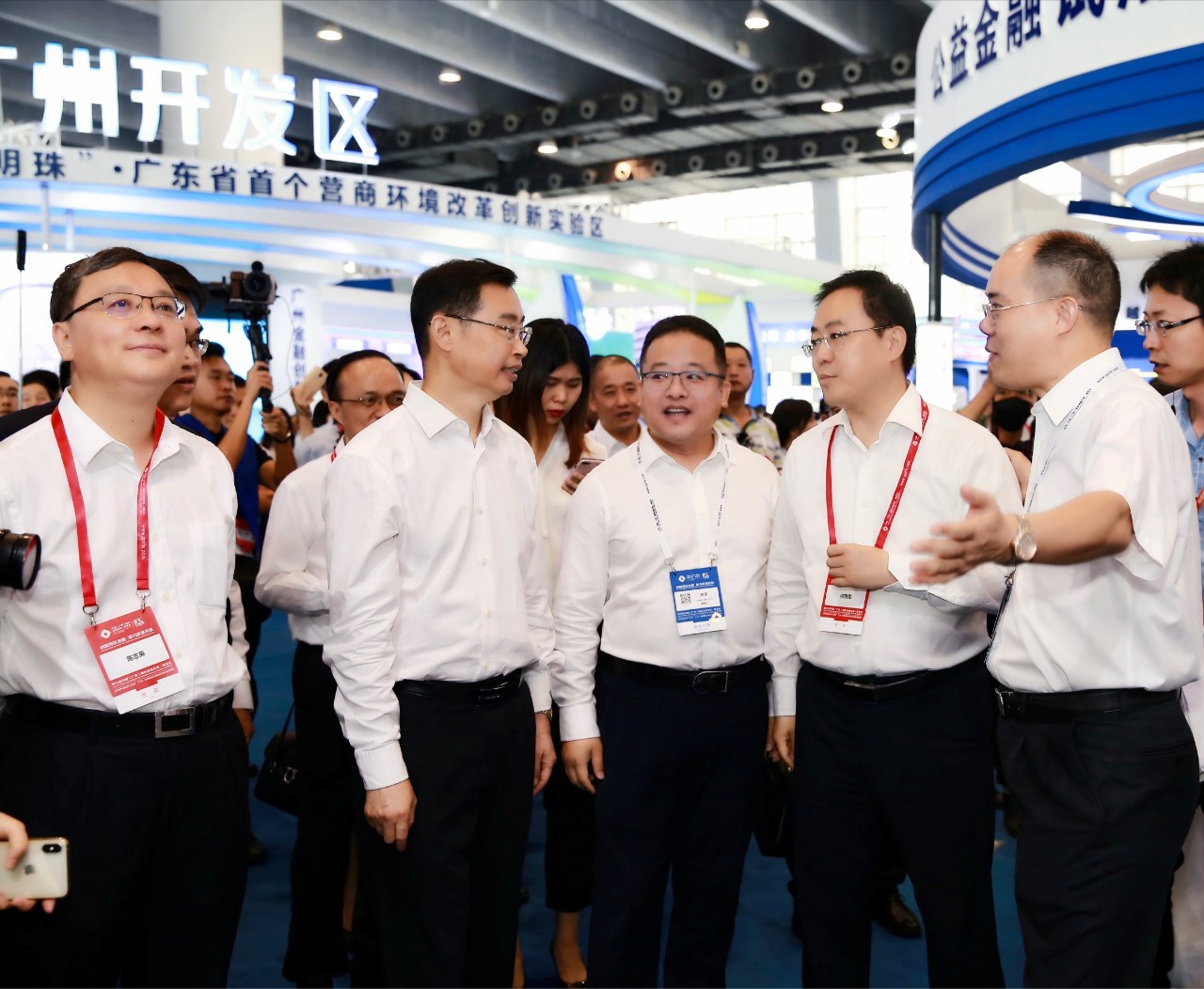 溫國(guó)輝市長(zhǎng)(前左二)、何曉軍局長(zhǎng)(前右二)、陳志英常務(wù)副市長(zhǎng)(前左一)在林濤董事長(zhǎng)(前左三)、曾金賢總裁(前右一)陪同下調(diào)研南粵基金金交會(huì)展廳