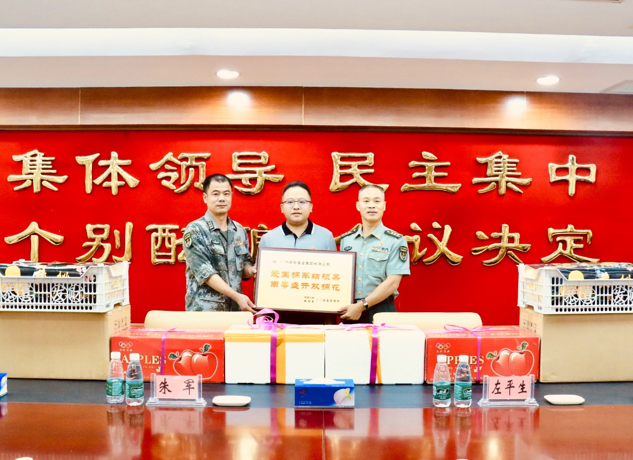 7月29日下午,在八一建軍節(jié)即將到來(lái)之際,廣州南粵基金集團(tuán)有限公司(簡(jiǎn)稱(chēng)“南粵基金”)董事長(zhǎng)林濤、總裁曾金賢率全體高管,來(lái)到中國(guó)人民解放軍聯(lián)勤保障32555部隊(duì)駐地,向全體官兵送上節(jié)日慰問(wèn)品并致以親切問(wèn)候和美好祝愿,并與部隊(duì)官兵親切座談,共敘軍民深厚情誼。