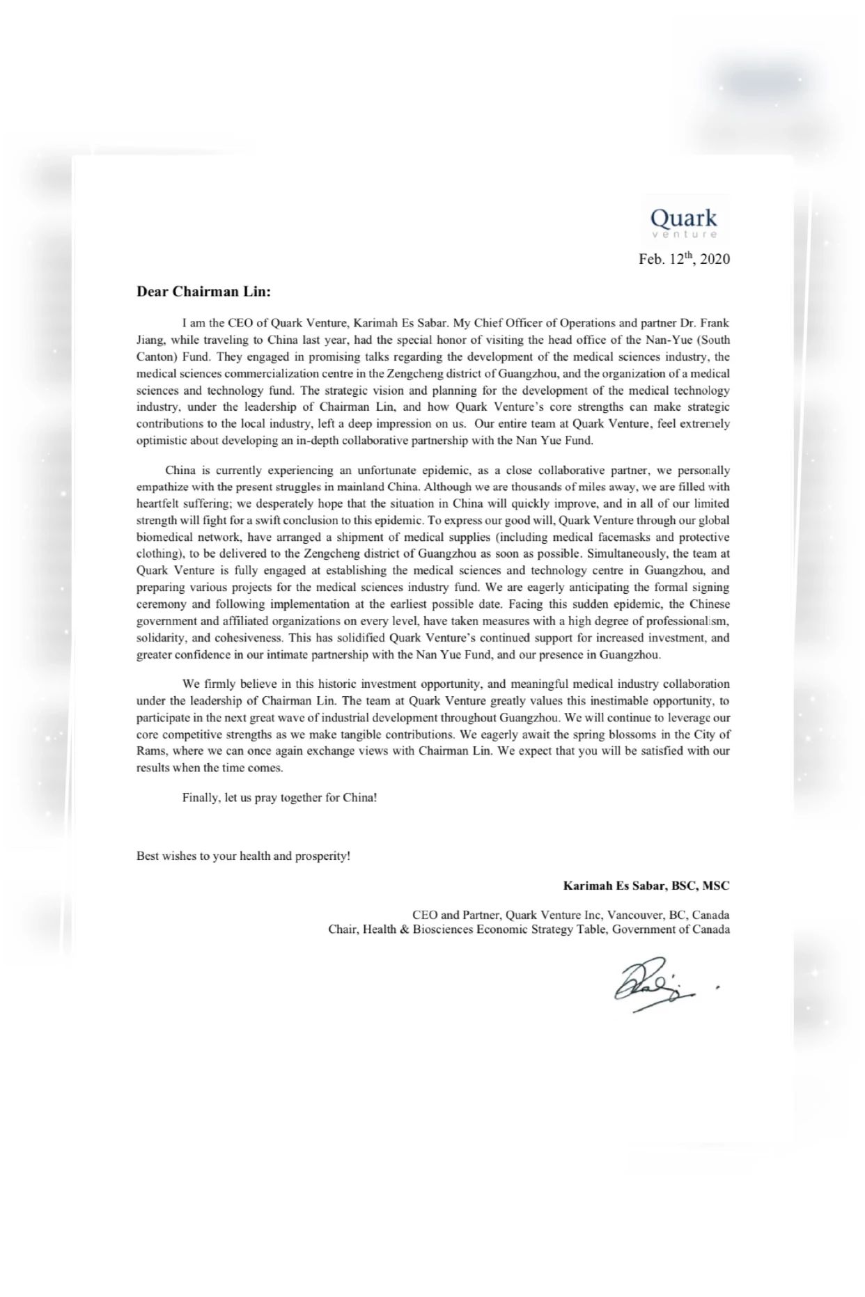 近日,廣州南粵基金集團(tuán)有限公司(簡(jiǎn)稱“南粵基金”)收到一封特殊來(lái)信,寫信者是加拿大聯(lián)邦政府經(jīng)濟(jì)戰(zhàn)略委員會(huì)主席、加拿大自然科學(xué)和工程研究國(guó)家委員會(huì)委員、全球健康科學(xué)基金董事會(huì)董事、夸克資本(Quark Venture)首席執(zhí)行官卡瑞瑪沙巴,來(lái)信是為了聲援中國(guó)戰(zhàn)勝疫情并對(duì)南粵基金支援國(guó)家抗擊疫情的義舉和發(fā)展醫(yī)療科技產(chǎn)業(yè)戰(zhàn)略規(guī)劃表達(dá)敬意。
