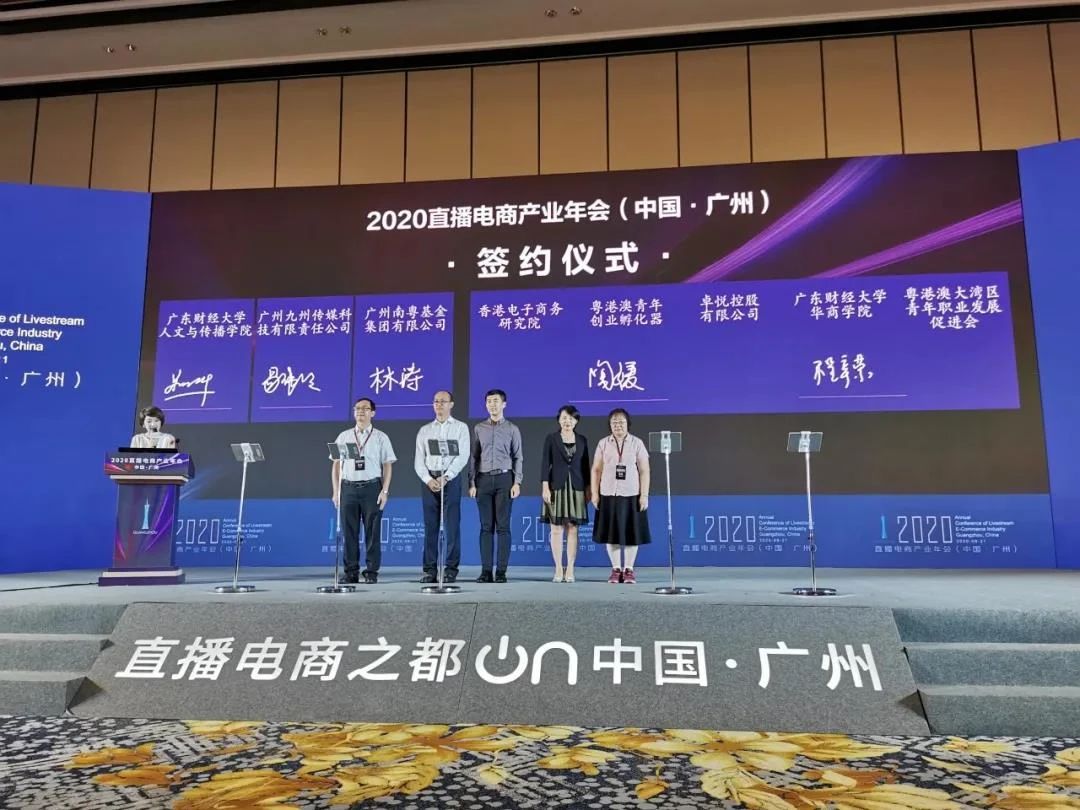 本屆年會(huì)上,“政校企”各方簽署了20余項(xiàng)合作備忘錄,內(nèi)容涵蓋電商平臺(tái)戰(zhàn)略合作、全產(chǎn)業(yè)鏈生態(tài)體系共建、直播人才高技能培養(yǎng)、青穗眾創(chuàng)扶持等項(xiàng)目。其中,廣州南粵基金集團(tuán)有限公司(簡(jiǎn)稱(chēng)“南粵基金”)與廣東財(cái)經(jīng)大學(xué)人文與傳播學(xué)院、九州傳媒進(jìn)行校企合作簽約。三方以《粵港澳大灣區(qū)發(fā)展規(guī)劃綱要》、《廣州市直播電商發(fā)展行動(dòng)方案(2020-2022年)》為指導(dǎo),以校政行企深度合作、多元協(xié)同創(chuàng)新、產(chǎn)學(xué)研創(chuàng)聯(lián)動(dòng)為基本路徑,整合各方優(yōu)質(zhì)資源力量、創(chuàng)新高校育人育才機(jī)制,在協(xié)同共建南粵傳媒產(chǎn)業(yè)學(xué)院等方面開(kāi)展戰(zhàn)略合作,從產(chǎn)業(yè)、金融等多個(gè)維度助力大學(xué)生創(chuàng)新創(chuàng)業(yè),為粵港澳大灣區(qū)電商直播產(chǎn)業(yè)發(fā)展提供高級(jí)人才支持和高校智力服務(wù)。