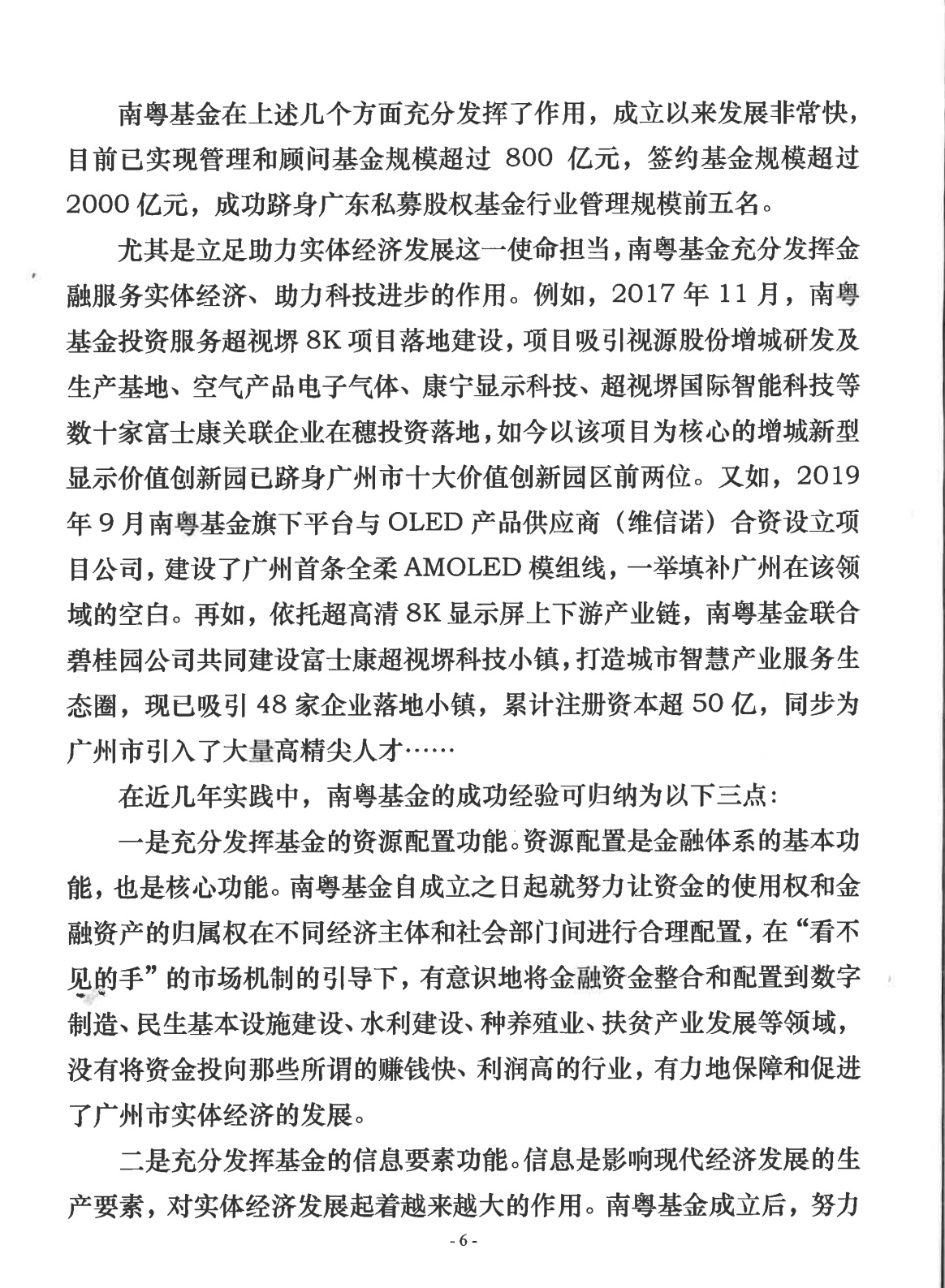 尤其是立足助力實(shí)體經(jīng)濟(jì)發(fā)展這一使命擔(dān)當(dāng),南粵基金充分發(fā)揮金融服務(wù)實(shí)體經(jīng)濟(jì)、助力科技進(jìn)步的作用。例如,2017年11月,南粵基金投資服務(wù)超視堺8K項(xiàng)目落地建設(shè),項(xiàng)目吸引視源股份增城研發(fā)及生產(chǎn)基地、空氣產(chǎn)品電子氣體、康寧顯示科技、超視堺國(guó)際智能科技等數(shù)十家富士康關(guān)聯(lián)企業(yè)在穗投資落地,如今以該項(xiàng)目為核心的增城新型顯示價(jià)值創(chuàng)新園已躋身廣州市十大價(jià)值創(chuàng)新園區(qū)前兩位。又如,2019年9月南粵基金旗下平臺(tái)與OLED產(chǎn)品供應(yīng)商(維信諾)合資設(shè)立項(xiàng)目公司,建設(shè)了廣州首條全柔AMOLED模組線,一舉填補(bǔ)廣州在該領(lǐng)域的空白。再如,依托超高清8K顯示屏上下游產(chǎn)業(yè)鏈,南粵基金聯(lián)合碧桂園公司共同建設(shè)富士康超視堺科技小鎮(zhèn),打造城市智慧產(chǎn)業(yè)服務(wù)生態(tài)圈,現(xiàn)已吸引48家企業(yè)落地小鎮(zhèn),累計(jì)注冊(cè)資本超50億,同步為廣州市引入了大量高精尖人才......