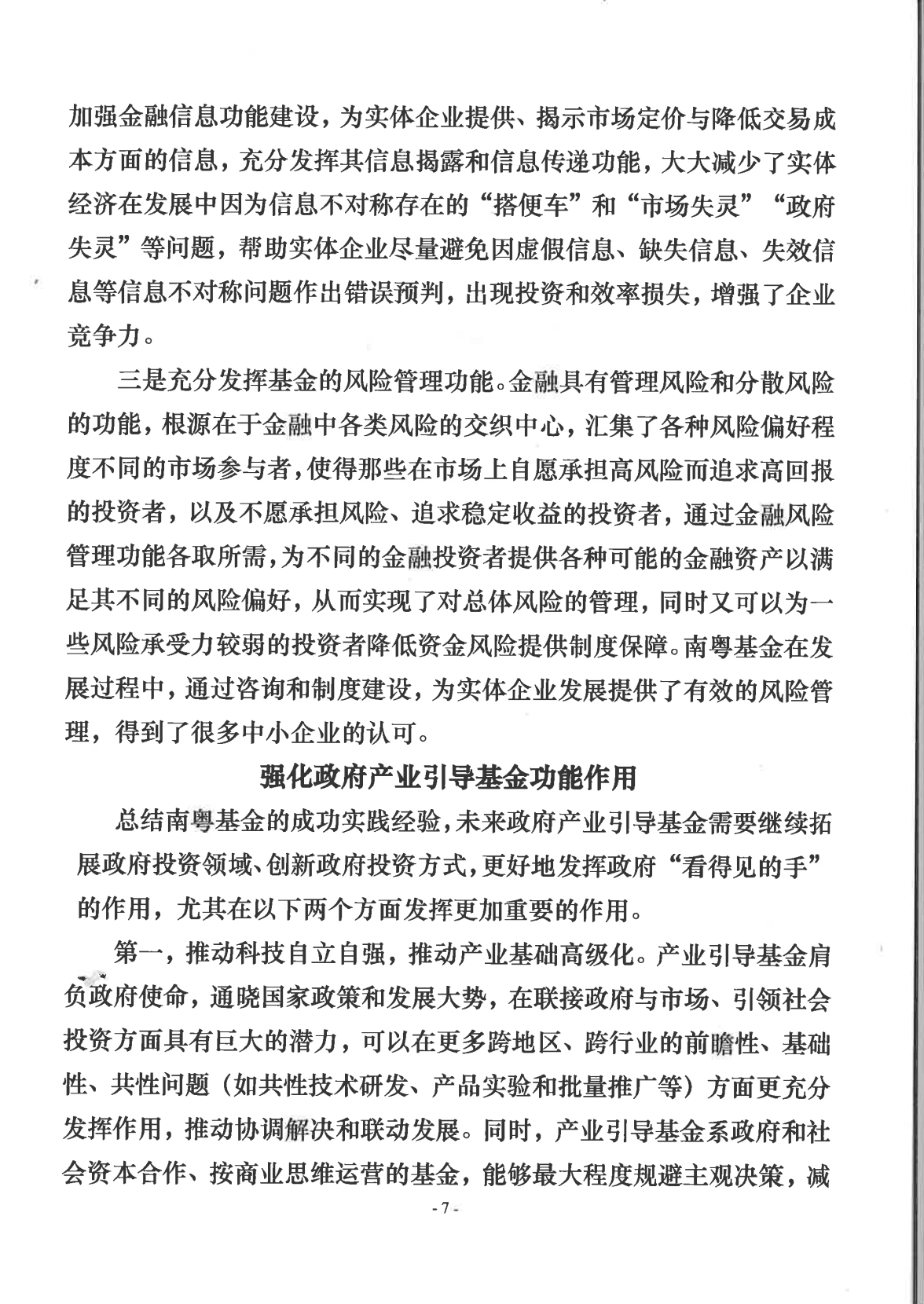 二是充分發(fā)揮基金的信息要素功能。信息是影響現(xiàn)代經(jīng)濟(jì)發(fā)展的生產(chǎn)要素,對(duì)實(shí)體經(jīng)濟(jì)發(fā)展起著越來(lái)越大的作用。南粵基金成立后,努力加強(qiáng)金融信息功能建設(shè),為實(shí)體企業(yè)提供、揭示市場(chǎng)定價(jià)與降低交易成本方面的信息,充分發(fā)揮其信息揭露和信息傳遞功能,大大減少了實(shí)體經(jīng)濟(jì)在發(fā)展中因?yàn)樾畔⒉粚?duì)稱存在的“搭便車”和“市場(chǎng)失靈”“政府失靈”等問題,幫助實(shí)體企業(yè)盡量避免因虛假信息、缺失信息、失效信息等信息不對(duì)稱問題作出錯(cuò)誤預(yù)判,出現(xiàn)投資和效率損失,增強(qiáng)了企業(yè)競(jìng)爭(zhēng)力。
