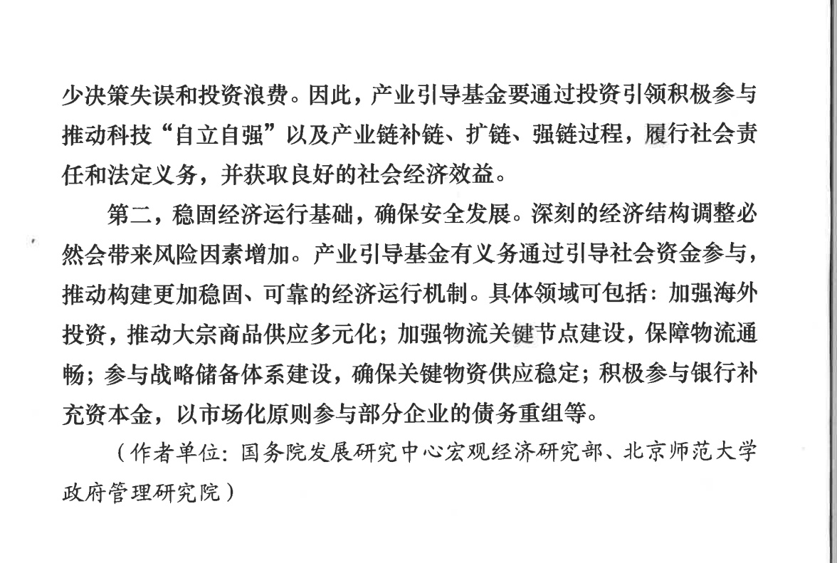 第二,穩(wěn)固經(jīng)濟(jì)運(yùn)行基礎(chǔ),確保安全發(fā)展。深刻的經(jīng)濟(jì)結(jié)構(gòu)調(diào)整必然會(huì)帶來(lái)風(fēng)險(xiǎn)因素增加。產(chǎn)業(yè)引導(dǎo)基金有義務(wù)通過引導(dǎo)社會(huì)資金參與,推動(dòng)構(gòu)建更加穩(wěn)固、可靠的經(jīng)濟(jì)運(yùn)行機(jī)制。具體領(lǐng)域可包括:加強(qiáng)海外投資,推動(dòng)大宗商品供應(yīng)多元化;加強(qiáng)物流關(guān)鍵節(jié)點(diǎn)建設(shè),保障物流通暢;參與戰(zhàn)略儲(chǔ)備體系建設(shè),確保關(guān)鍵物資供應(yīng)穩(wěn)定;積極參與銀行補(bǔ)充資本金,以市場(chǎng)化原則參與部分企業(yè)的債務(wù)重組等。