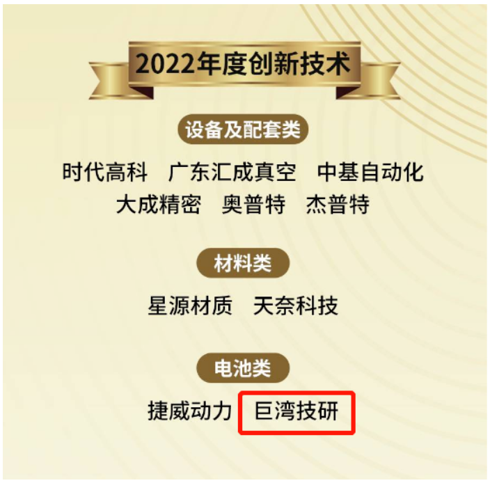 近日,以“引領(lǐng)全球之中國力量”為主題,2022高工鋰電金球獎頒獎典禮隆重舉行。南粵基金投資企業(yè)巨灣技研、中偉股份分別榮獲高工金球獎“2022年度創(chuàng)新技術(shù)”“2022中國鋰電材料TOP50”和“2022年度上游和再生資源企業(yè)”等三大獎項(xiàng)。