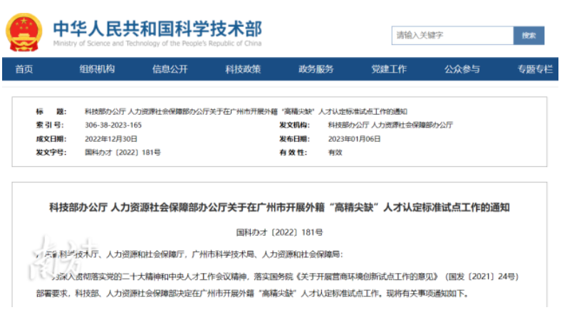 近日,科技部、人力資源社會(huì)保障部發(fā)布通知,在廣州市開展外籍“高精尖缺”人才認(rèn)定標(biāo)準(zhǔn)試點(diǎn)工作。廣州成為全國(guó)開展這項(xiàng)試點(diǎn)工作的首批六個(gè)城市之一。