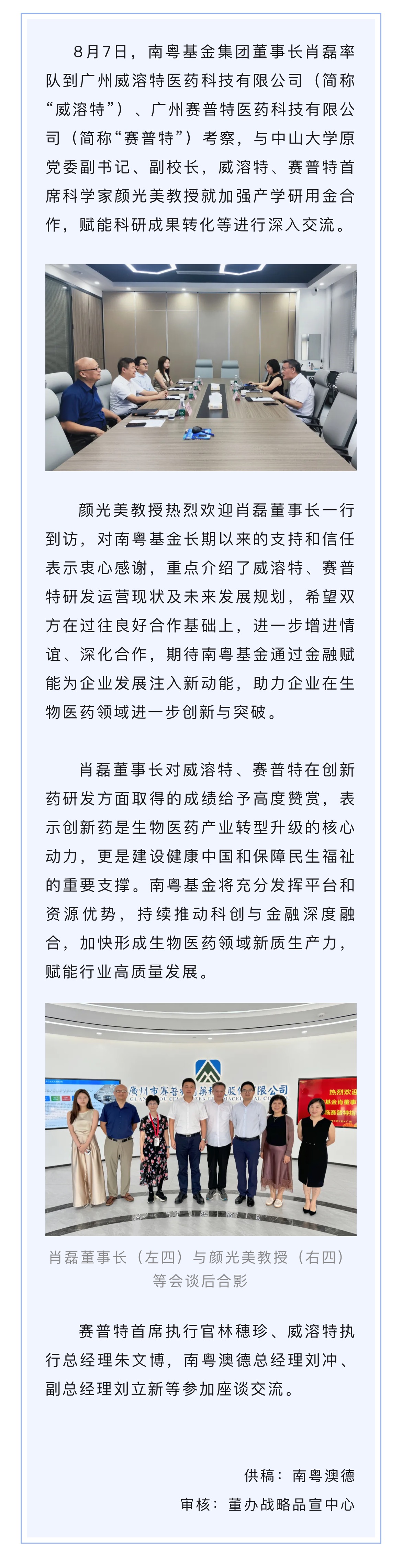 南粵基金董事長(zhǎng)肖磊考察生物醫(yī)藥企業(yè)威溶特、賽普特