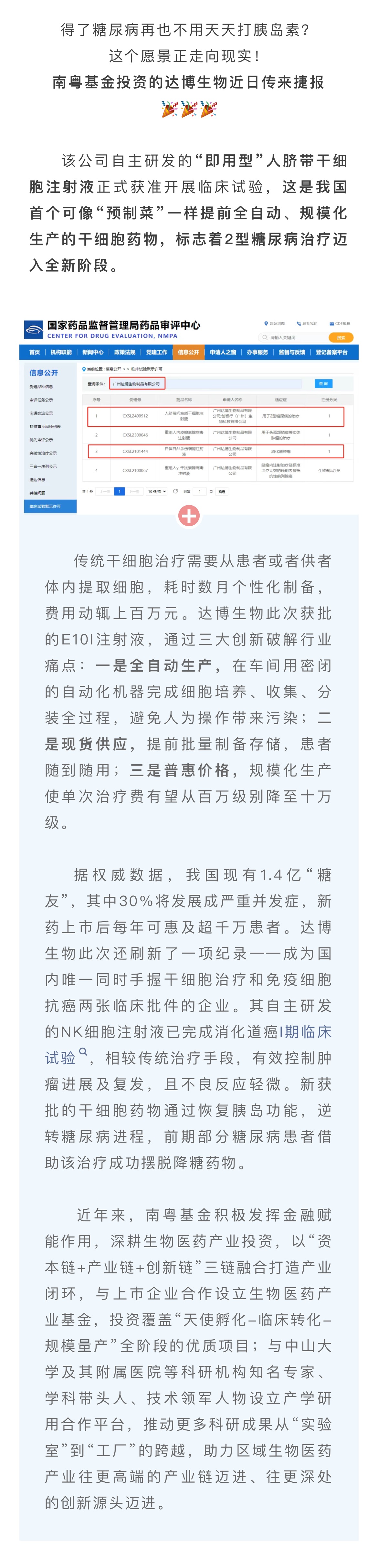 新突破!南粵基金投資項(xiàng)目——國(guó)產(chǎn)“萬(wàn)能干細(xì)胞藥”進(jìn)入臨床