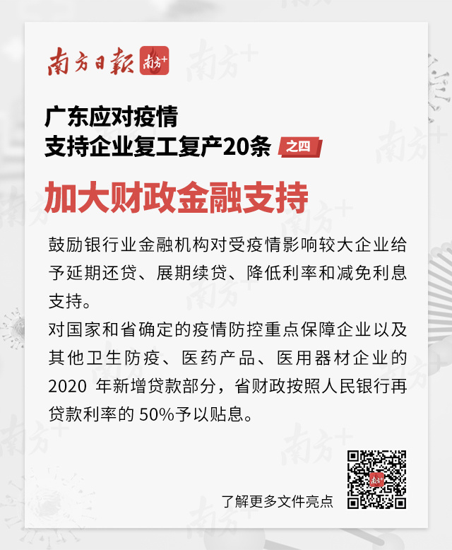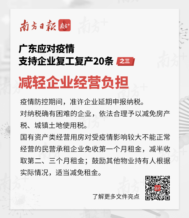 2月6日下午,廣東省政府正式印發(fā)《關(guān)于應(yīng)對(duì)新型冠狀病毒感染的肺炎疫情支持企業(yè)復(fù)工復(fù)產(chǎn)的若干政策措施》,從進(jìn)一步加大保障企業(yè)復(fù)工復(fù)產(chǎn)工作力度、降低企業(yè)用工成本、減輕企業(yè)經(jīng)營(yíng)負(fù)擔(dān)、加大財(cái)政金融支持、優(yōu)化政府服務(wù)等關(guān)鍵環(huán)節(jié),提出了5方面共20項(xiàng)政策措施,全力支持和推動(dòng)受疫情影響的各類企業(yè)復(fù)工復(fù)產(chǎn)。五圖輕松讀懂>>>