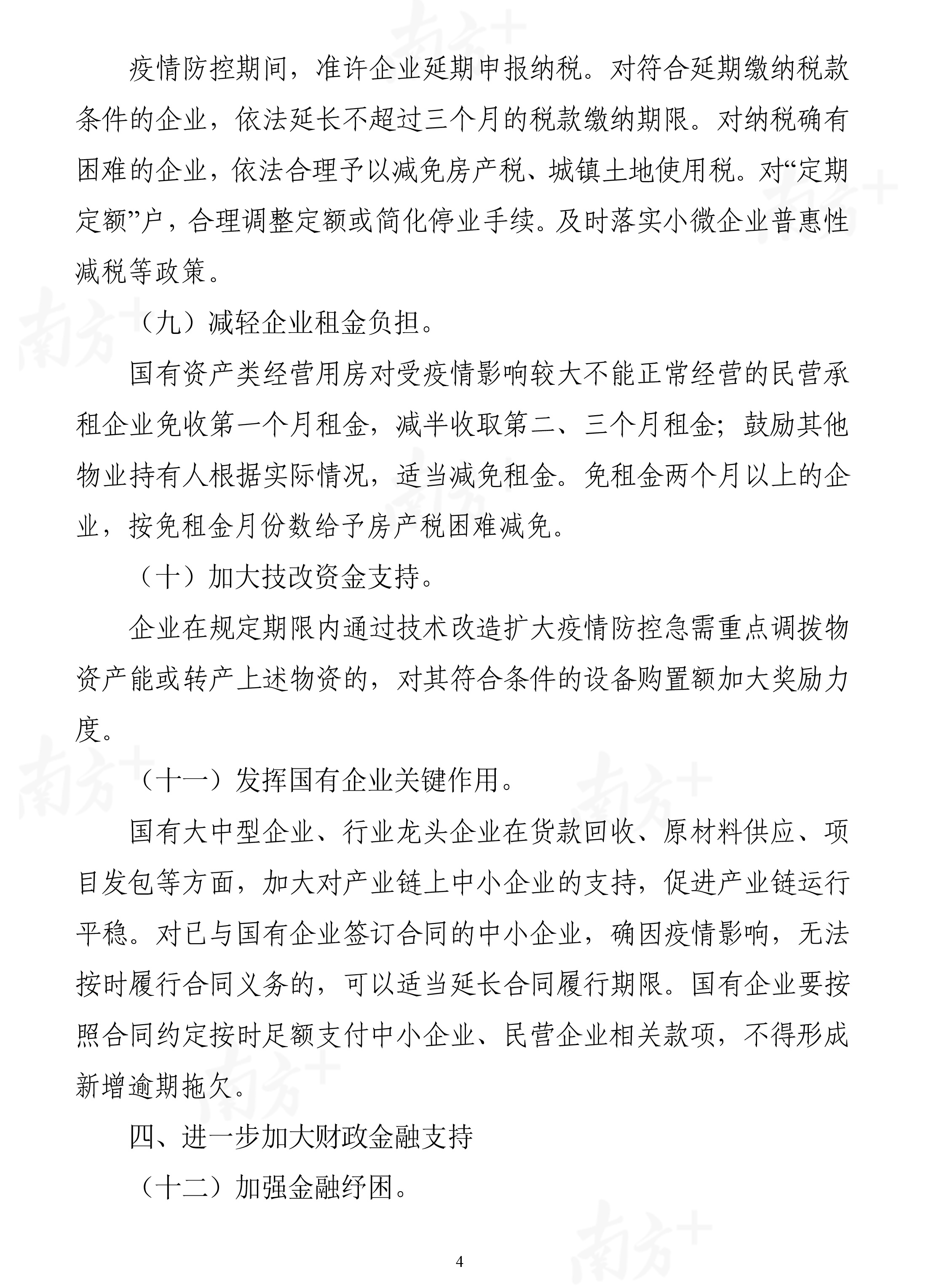 針對(duì)企業(yè)普遍反映的租金、稅費(fèi)和違約風(fēng)險(xiǎn)等問(wèn)題,《政策措施》提出,疫情防控期間準(zhǔn)許企業(yè)延期申報(bào)納稅。對(duì)符合延期繳納稅款條件的企業(yè),依法延長(zhǎng)不超過(guò)三個(gè)月的稅款繳納期限。對(duì)納稅確有困難的企業(yè),依法合理予以減免房產(chǎn)稅、城鎮(zhèn)土地使用稅。